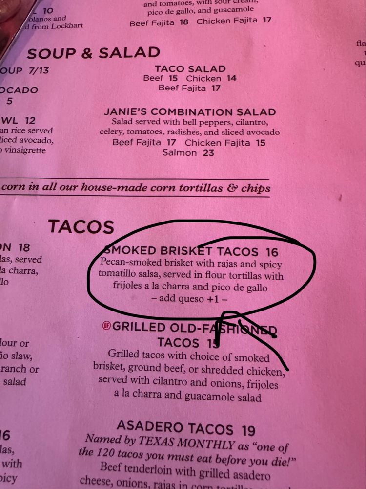 Two Pecan-Smoked Brisket Tacos garnished with Rajas & served in Flour Tortillas with Tomatillo Sauce, Frijoles a la Charra & Pico de Gallo.